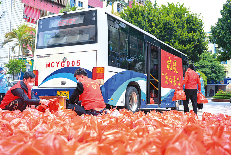 4月1日,在泉州市丰泽区五矿大厦临时打包中转站,志愿者将生活物资打包、装车。本轮疫情发生以来,福建泉州为解决社区困难家庭买菜难问题,启动了“爱心菜吧”免费配送工作。新华社发