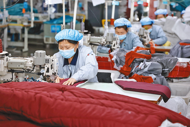 4月6日,工人在山东省滨州市一家企业生产车间内加紧生产供应上海的睡袋。 今年以来,各地在做好疫情防控的同时,采取一系列稳增长举措,确保企业生产有序,工作稳步推进。 新华社发