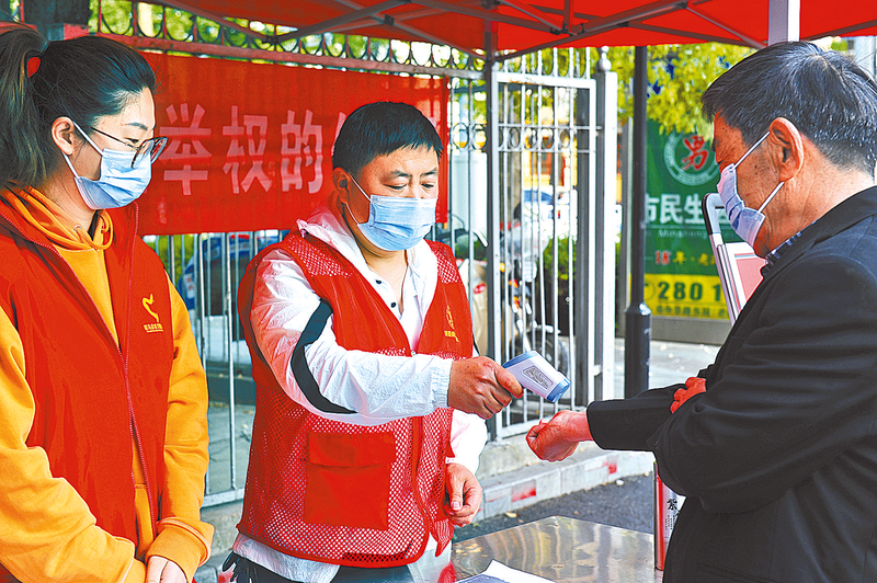 4月19日,驿城区西园街道驿城新村社区志愿者在小区出入口值守,严格落实体温测量、检查出入证和扫验“场所码”等疫情防控措施。 记者 吴胜军 摄