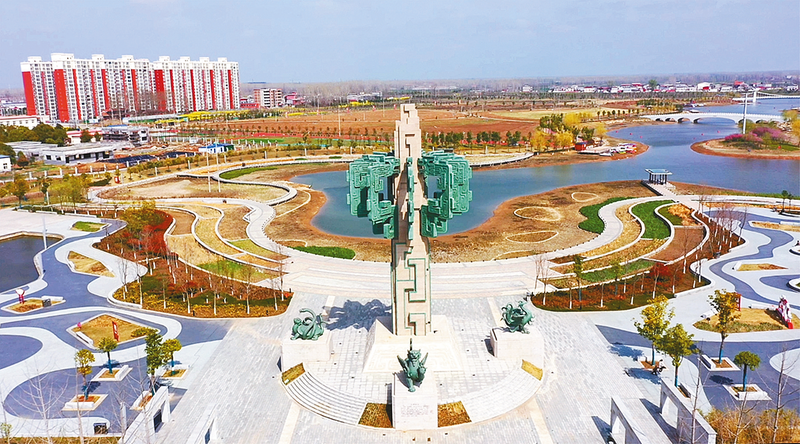 位于汝南县城南侧占地720亩的南海湿地公园是一处生态多样,河水与绿色植被共融的自然生态湿地公园。入口处的标志性建筑是九面“中”,从每个角度看都是一个方方正正的“中”字,体现了“持中守正,通达包容”的天中文化。目前,该公园已成为附近居民闲暇时间游玩和散步的最佳场所。