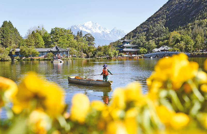 4月22日,在云南省丽江市古城区黑龙潭公园,环卫工人打捞水面垃圾。当日是世界地球日,人们以实际行动爱护环境,守护我们共同的家园。 新华社发