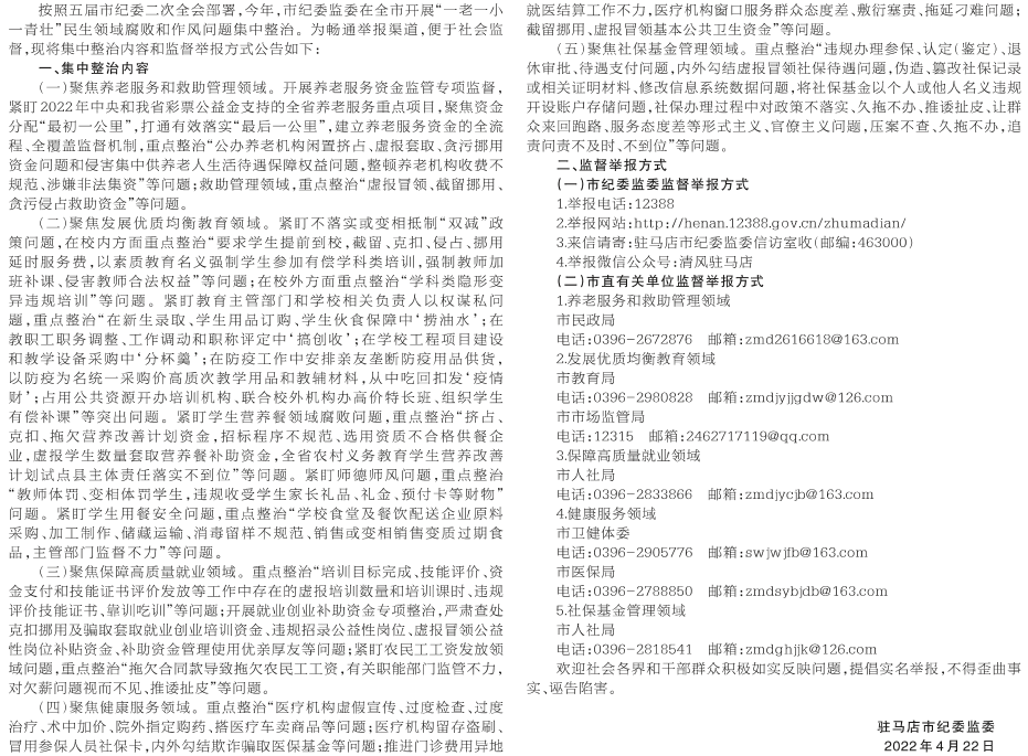 关于公布“一老一小一青壮”民生领域腐败和作风问题集中整治内容和监督举报方式的公告