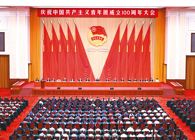 人民大会堂二层宴会厅气氛隆重热烈。主席台上方悬挂着“庆祝中国共产主义青年团成立100周年大会”会标,后幕正中悬挂团徽,团徽下方是“1922-2022”字标,10面红旗分列两侧。
