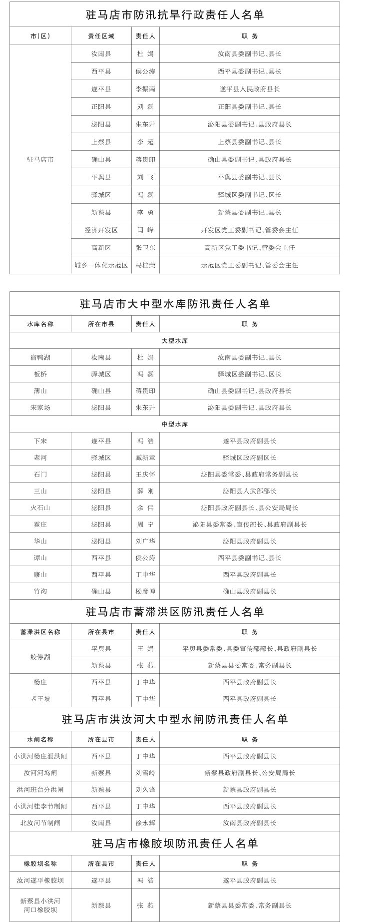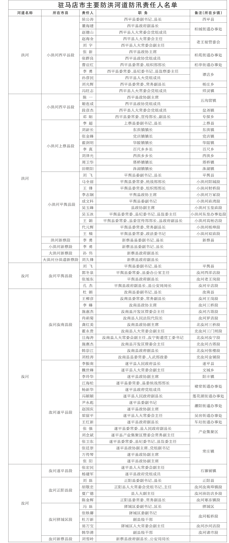 关于驻马店市重点防洪工程防汛抗旱行政责任人名单的通报