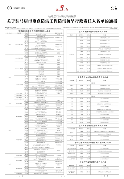 关于驻马店市重点防洪工程防汛抗旱行政责任人名单的通报