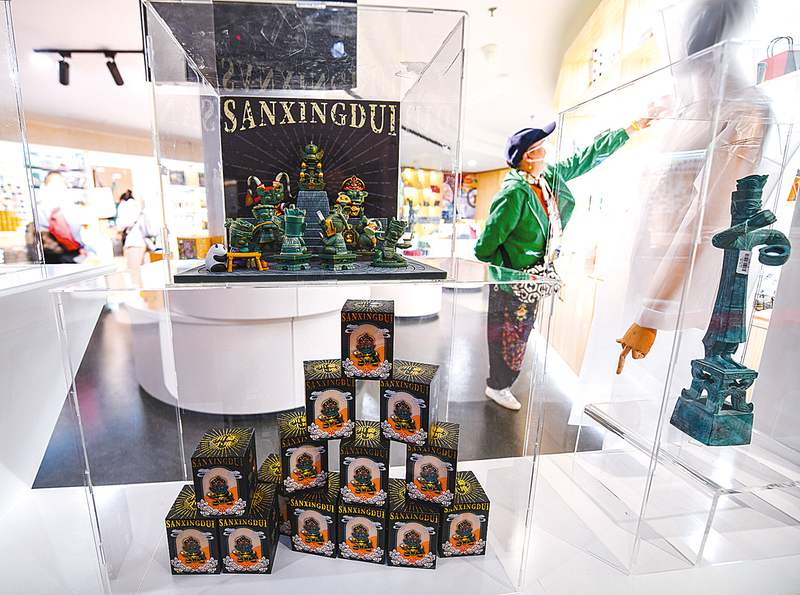 这是5月16日在三星堆博物馆文创商店拍摄的盲盒系列产品。 近年,三星堆遗址重要考古发现成果陆续公布,带动三星堆博物馆的文创产品设计销售热潮,一些文创产品取材于发掘出土的金面罩、青铜器等文物,受到人们的欢迎。 新华社记者 王 曦 摄