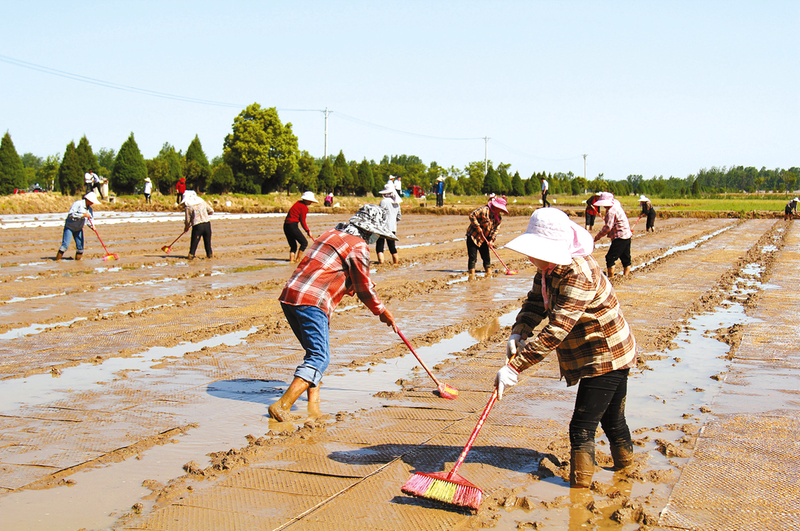 5月17日上午,在确山县留庄镇三宗寺村禾盛生态农业有限公司富硒香粳优质稻育苗基地,40多名留守妇女有的在塑料软盘上撒水稻种子,有的用扫帚把水稻种子扫进塑料软盘孔内,有的在覆盖薄膜……田野里呈现一派繁忙的劳作景象。