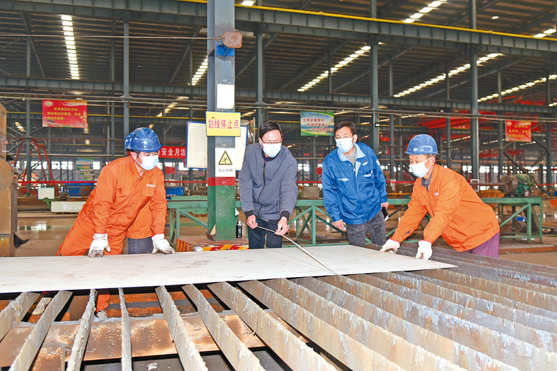 劳模在车间指导工人生产。