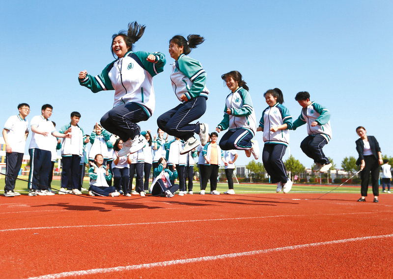 5月22日,青岛通济实验学校高三学生在进行集体跳绳比赛。