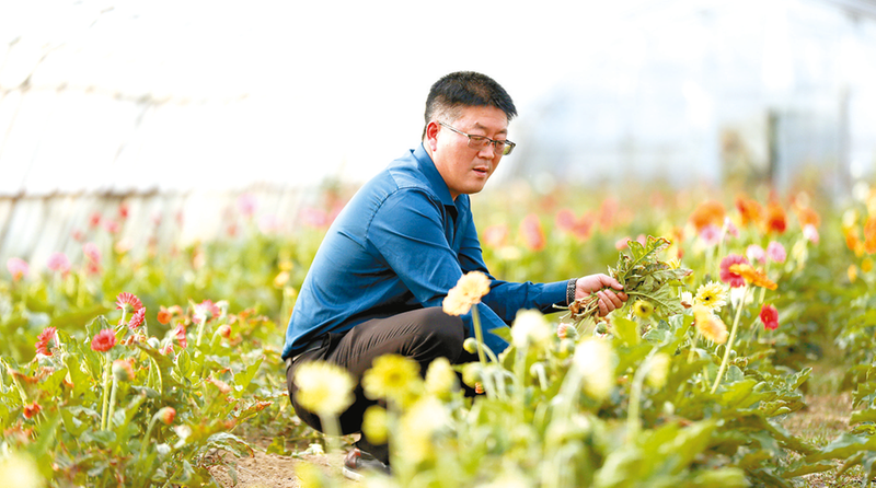 余长旺正在查看花卉长势。 记者 侯伟峰通讯员 刘旭 文/图
