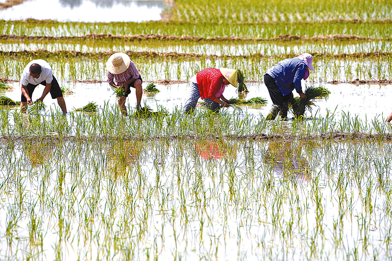 6月17日,五河县新集镇农民在田间插秧。时下,安徽省蚌埠市五河县农民抢抓农时忙夏种,田间地头一派繁忙景象。 新华社记者 刘军喜 摄