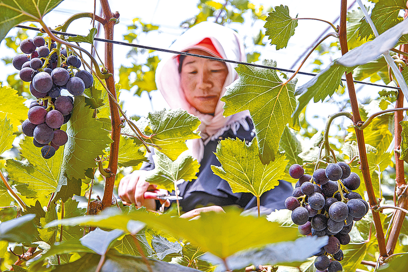 工人在宁夏灵武白芨滩国家级自然保护区甜水河管理站的葡萄温棚内劳作(6月14日摄)。宁夏灵武白芨滩国家级自然保护区位于毛乌素沙地西南边缘,这里曾经风沙危害严重。通过多年探索,当地构建了“六位一体”的治沙发展模式,利用沙区特有资源发展经果林、沙漠蔬果、苗木培育、生态养殖及生态旅游等产业,实现治沙与致富同步发展,让沙地焕发勃勃生机。 新华社记者 杨植森 摄