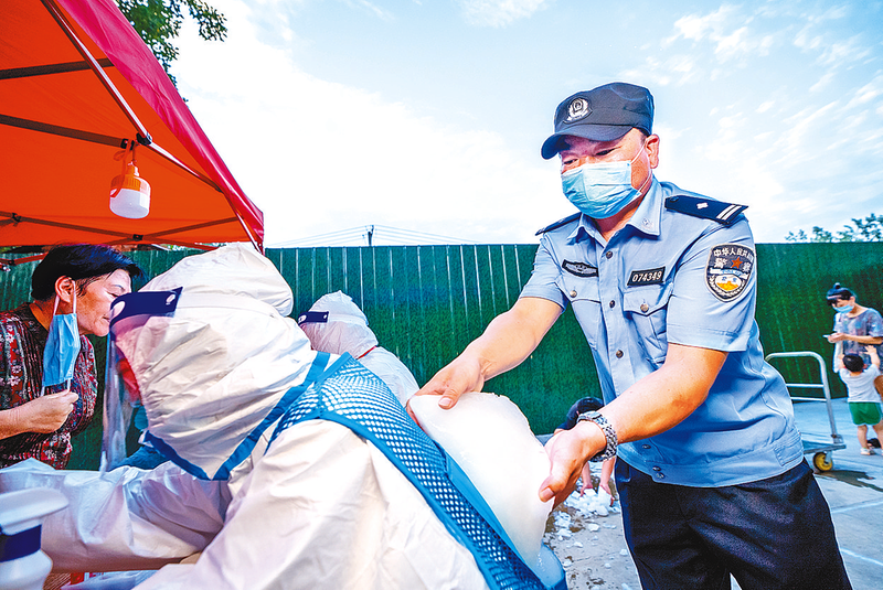 图① 7月18日,西平县民警手拿冰块在给医护人员降温。