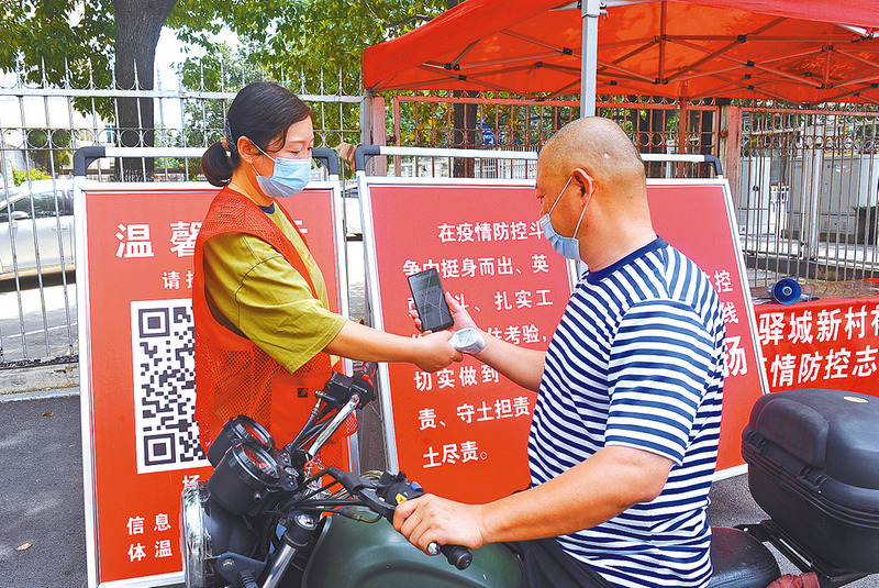 图④ 7月19日,驿城区橡林街道张楼社区工作人员在为进入社区群众测量体温。