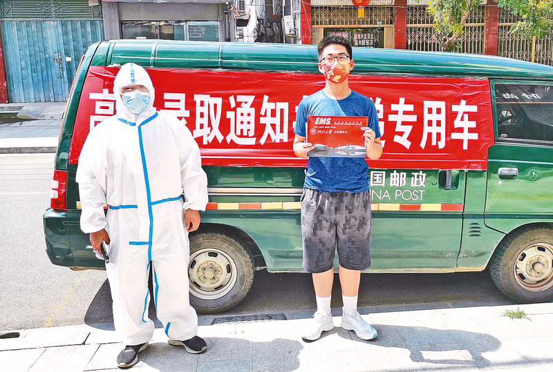 7月19日,在泌阳县香菇市场南门,泌阳县邮政分公司揽投部揽投员李庭义仔细核对相关证件后,将来自浙江大学高考录取通知书交到贾雨锡手中。随着首封大学录取通知书的安全送达,泌阳县将迎来2022年高考录取通知书投递高峰,考生将陆续收到各批次的录取通知书。记者 张 建 通讯员 曹 舒 摄影报道