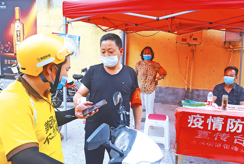 近日,驿城区橡林街道张楼社区严格落实防控措施,图为工作人员对外卖人员进行体温测量。