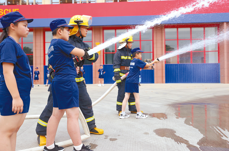 7月25日,在福建省厦门市集美区北站消防救援站,小学生们在消防员的指导下体验手持水枪“灭火”。当日,福建省厦门市集美区首批“暑期消防夏令营”在集美区北站消防救援站开营。35名小学生将在消防员的带领下,进行为期5天的队列训练等,提高自身的消防安全意识和自防自救能力。 新华社发