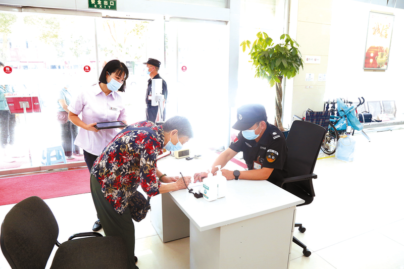 为全面保障员工和客户生命安全,7月26日,中行驻马店分行在做好日常疫情防控工作的基础上,抓好重点场所、重点环节的精准精细防控。图为工作人员引导客户扫码登记。