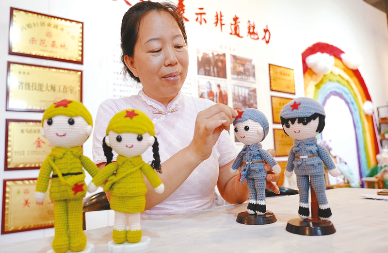 近日,驻马店市级非物质文化遗产余氏钩编第四代传承人余水云满怀深情创作了一组八一主题作品,以表达对军人的敬仰之情。 记者 张 建 摄