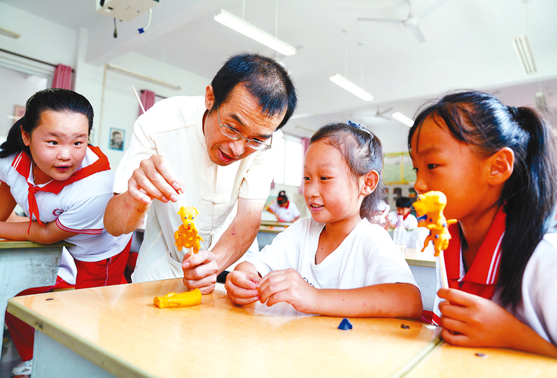 7月28日,在山东省齐河县祝阿镇马坊社区乡村“复兴少年宫”,王向东在教小朋友捏面塑。 山东省德州市齐河县作为省乡村“复兴少年宫”建设试点,首批建成57处乡村“复兴少年宫”,挖掘优秀乡村“复兴少年宫”师资担任辅导员,动员民间艺人、非物质文化遗产传承人、“五老”志愿者等积极参与,通过书法、剪纸、面塑等形式多样的活动,丰富乡村少年儿童的假期生活。 新华社记者 郭绪雷 摄
