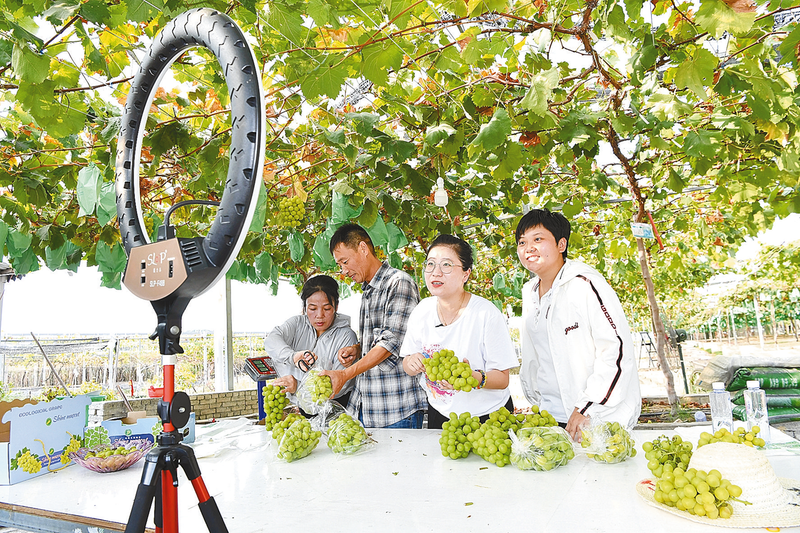 在福建省福安市赛岐镇象环村的葡萄种植园,返乡创业大学生林恩辉(右二)、陈莉瑾(右一)在推销刚采摘的葡萄,一旁的果农陈招旺夫妇在装箱(8月9日摄)。 时下正值福建农渔产品收获上市时节,在田间地头及沿海乡镇涌现众多乡村直播间,大批农村青年及返乡创业大学生投身网络电商成为直播带货主播。直播带货等新兴电商形态逐渐成为农村电商的主力军,为乡村振兴增添了新动能。 新华社记者 姜克红 摄