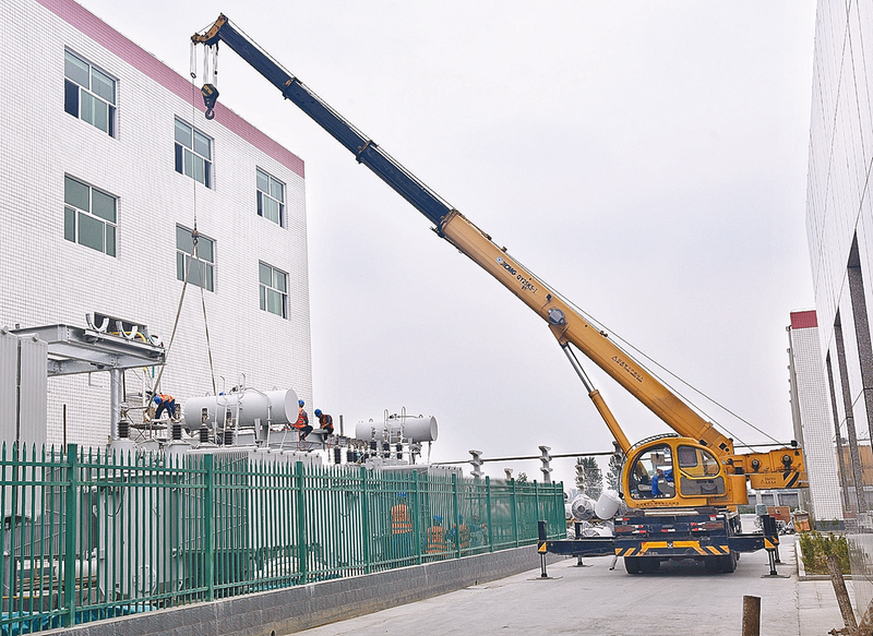 河南金玉锋大健康生物产业园项目总投资106亿元,占地面积2700多亩,主要从事玉米淀粉、玉米胚芽油、玉米纤维等产业深加工。目前,淀粉和玉米油项目生产线主设备已同步安装完成,预计2022年底投入试生产。项目全部建成投产后,将成为百亿级大健康生物产业园区,年可加工转化玉米600万吨,对当地及周边地区的玉米实现“吃干榨净”。图为工人们在项目配套建设的发电厂安装变压器。