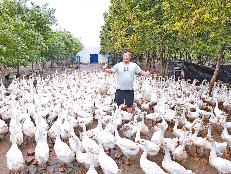 经多方考察,边疆投资了“苗木种植+林下养鹅”项目。在镇政府的大力扶持下,经过两年的发展,如今他的养殖场已有2000多只鹅。
