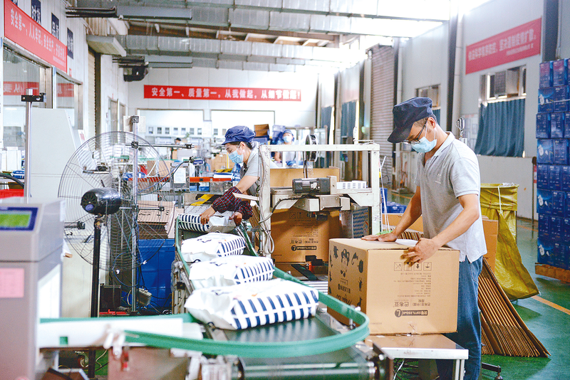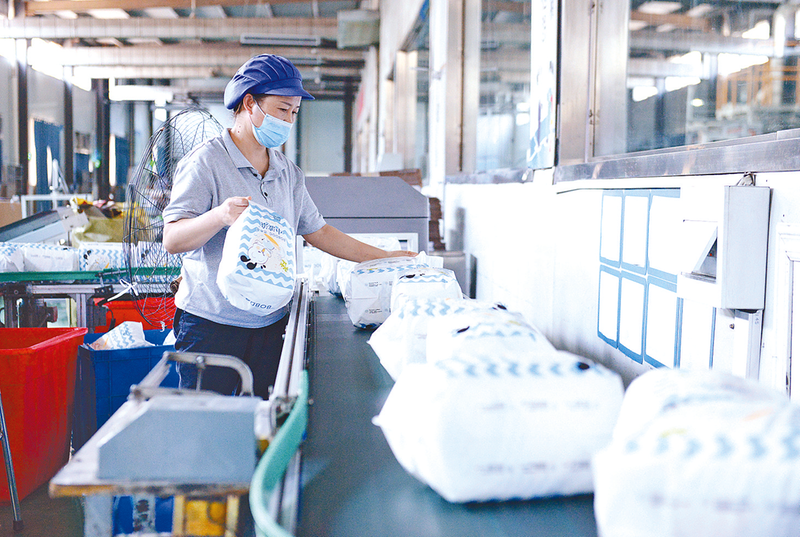 9月2日,正阳县开发区河南百蓓佳卫生用品有限公司车间内,机器轰鸣,工人们正在加紧生产婴儿纸尿裤、尿片等卫生用品订单。