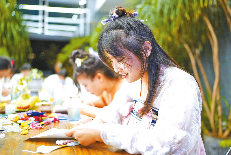 9月8日,身着汉服的市民体验纸上刺绣。