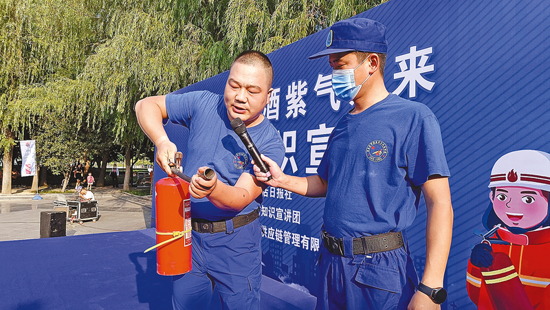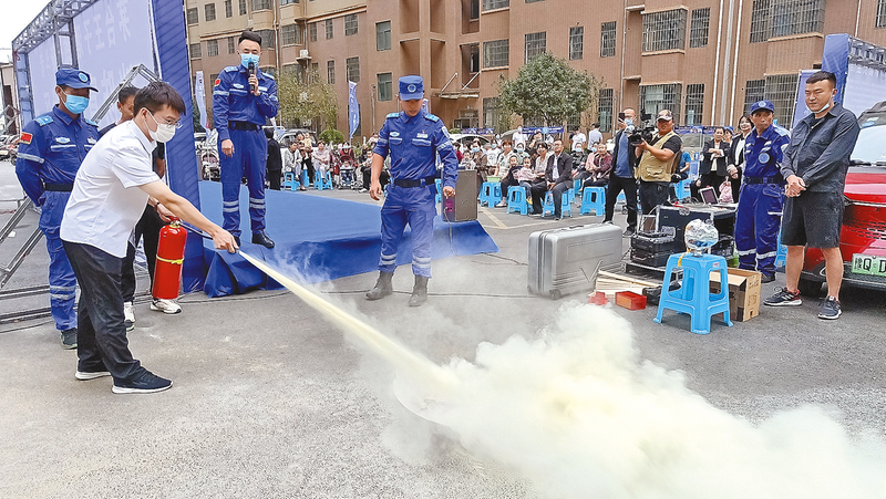 近日,河南茅酱酒业销售有限公司驻马店分公司在茵悦世家小区开展“茅台王子酒 致敬奋斗者”主题消防宣传活动。图为演示灭火。 记者 曾富强 摄