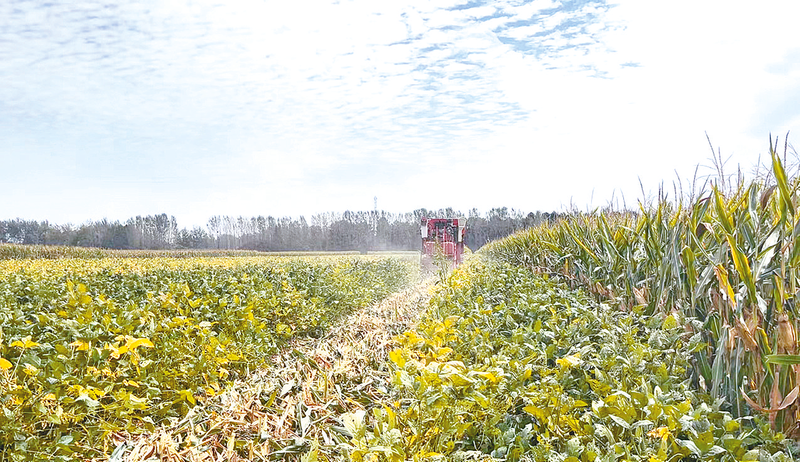 玉米联合收割机在收割玉米。 见习记者 焦 琳 摄 本报讯(记者 冯 帅 见习记者焦 琳)近日,记者在遂平县和兴镇大刘庄村的大豆玉米带状复合种植田里看到,一台收割机正在对玉米完成收割、分离、脱粒等工作。在同一块田里,大豆和玉米整齐划一、排列有序,大豆植株丰茂、豆荚满挂,一旁的玉米更是身姿挺拔,玉米棒有30厘米长,像一个个金色的棒槌。