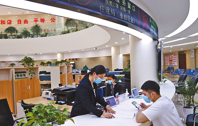 市民中心住房维修资金服务窗口工作人员为市民办理住房维修资金相关业务。