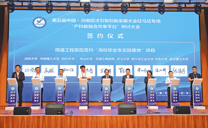 王复明院士(左五)在第五届中国·河南招才引智创新发展大会驻马店专场与众多高校签约,共同打造坝道工程医院新高地。
