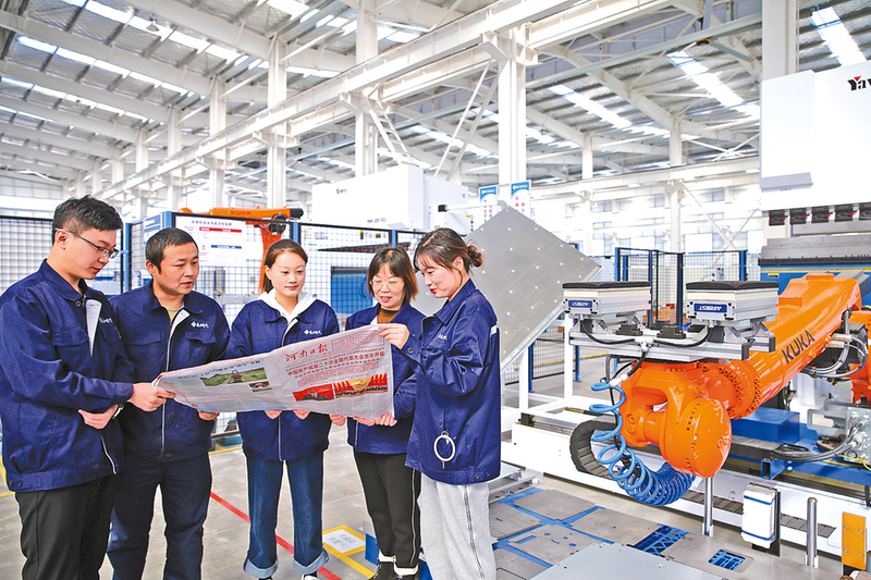 10月18日,西平县华鼎电气5G智慧杆塔产业园内,青年技术骨干在认真学习党的二十大报告。