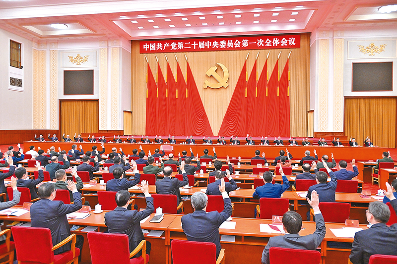 10月23日,中国共产党第二十届中央委员会第一次全体会议在北京人民大会堂举行。习近平同志主持会议并在当选中共中央委员会总书记后作重要讲话。 新华社记者 鞠 鹏 摄