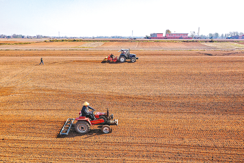 图为正阳县寒冻镇农机手驾驶拖拉机在田间地头来回穿梭,旋耕、施肥、播种。