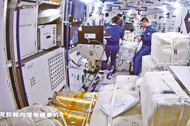 11月12日,在北京航天飞行控制中心拍摄的天舟五号货运飞船与空间站组合体完成自主快速交会对接后天和核心舱内的情况。