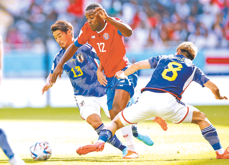 11月27日,哥斯达黎加队球员乔尔-坎贝尔(中)突破日本队球员守田英正(左)、堂安律的防守。当日,在卡塔尔赖扬艾哈迈德·本·阿里体育场进行的2022卡塔尔世界杯足球赛E组比赛中,日本队对阵哥斯达黎加队。 新华社记者 王丽莉 摄