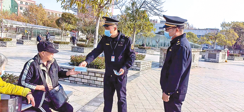 “师傅您好,现在疫情防控形势比较紧张,请自觉戴好口罩。”驿城区城管局执法人员耐心劝导市民注意戴好口罩。
