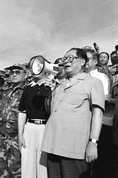 1998年8月13日至14日,江泽民同志亲赴湖北长江抗洪抢险第一线,看望、慰问、鼓励奋战在抗洪抢险第一线的广大军民,指导抗洪抢险斗争。这是8月13日江泽民同志在洪湖市乌林镇中沙角险段大堤上,向正在抗洪抢险的军民发表讲话。