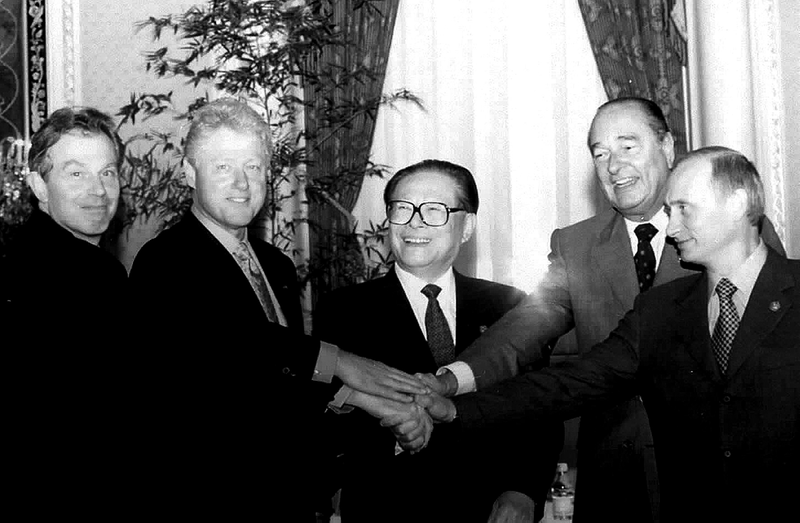 2000年9月7日,由中国倡议的联合国安理会五个常任理事国首脑会议在纽约举行。江泽民同志(中)同法国总统希拉克(右二)、俄罗斯 总统 普京(右一)、英国首相布莱尔(左一)、美国总统克林顿(左二)握手合影。