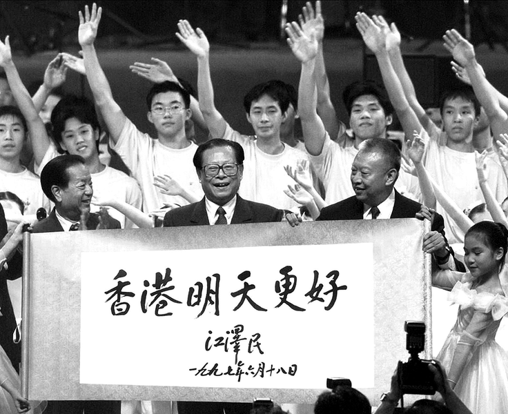 一九九七年七月一日上午十时,中华人民共和国香港特别行政区成立 庆典在香港会展中心新翼举行。在庆典仪式上展示了江泽民同志亲手题写的 “香港明天更好”书法卷轴。