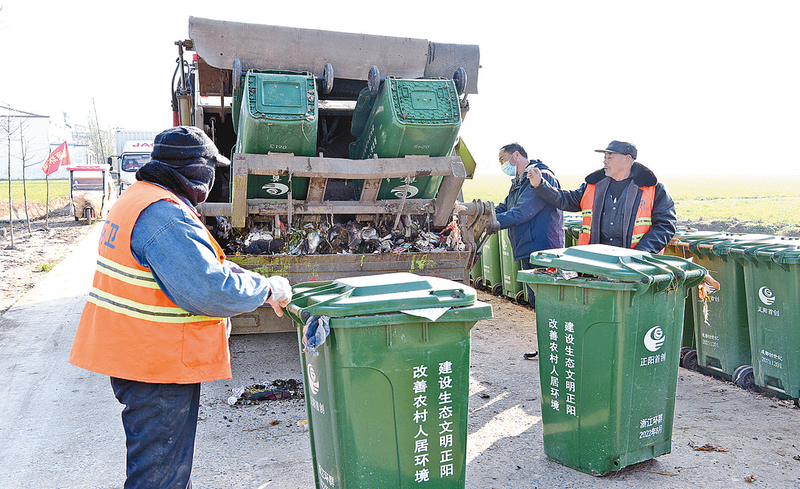 近日,正阳县彭桥乡小赵村的环卫工人正在清运垃圾中转站的垃圾。