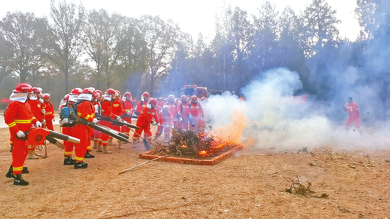 森林防灭火突击队进行灭火实战演练。 为规范森林火灾预防与处置流程,提高森林火情早期处置能力,12月9日,全省森林火情早期处置实战演练在我市国有泌阳县板桥林场举行。