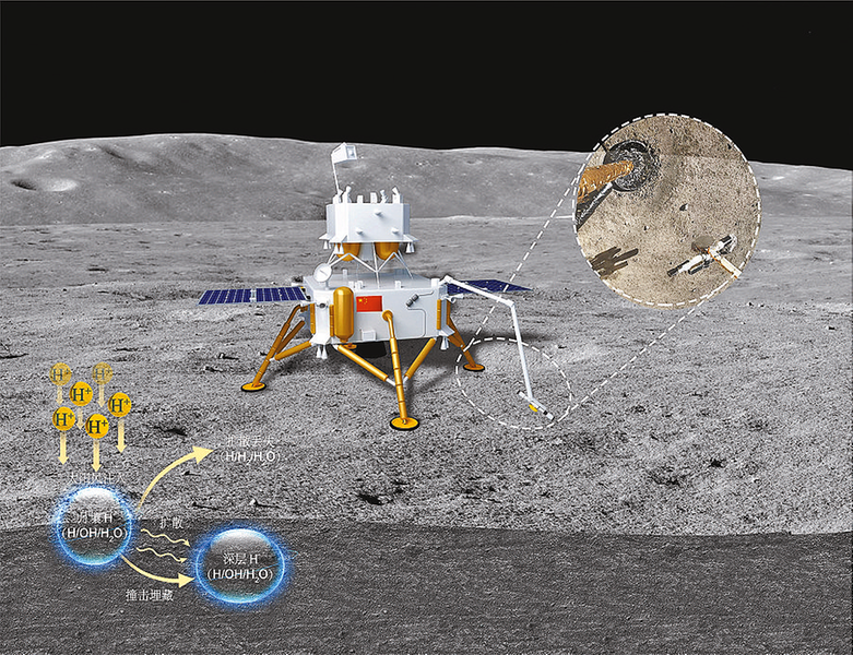 嫦娥五号月壤揭示太阳风为月球带来可利用的水。这是太阳风氢的注入、保存与扩散丢失模型图(2022 年11月23日绘制)。 新华社发