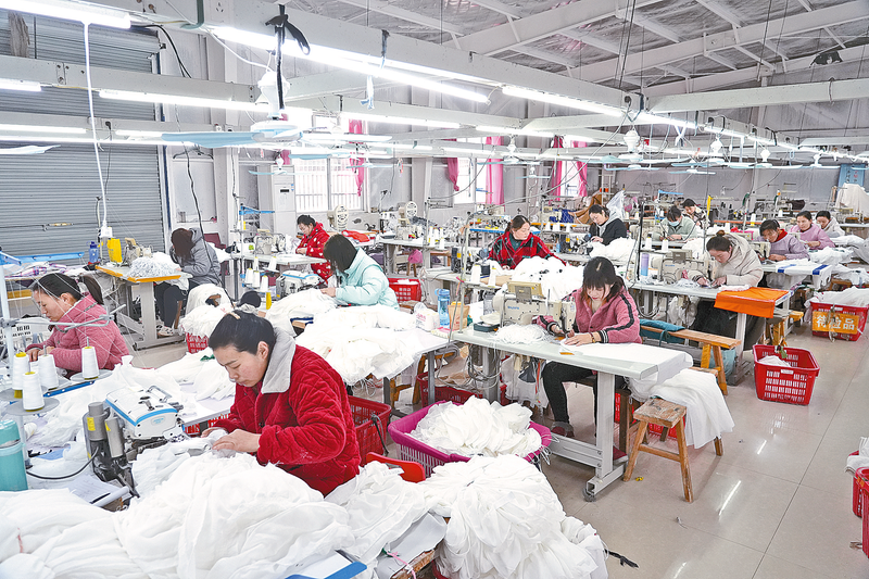 近日,在新蔡县化庄乡化庄村村级产业基地服装加工生产车间里,村民正在加工服装。