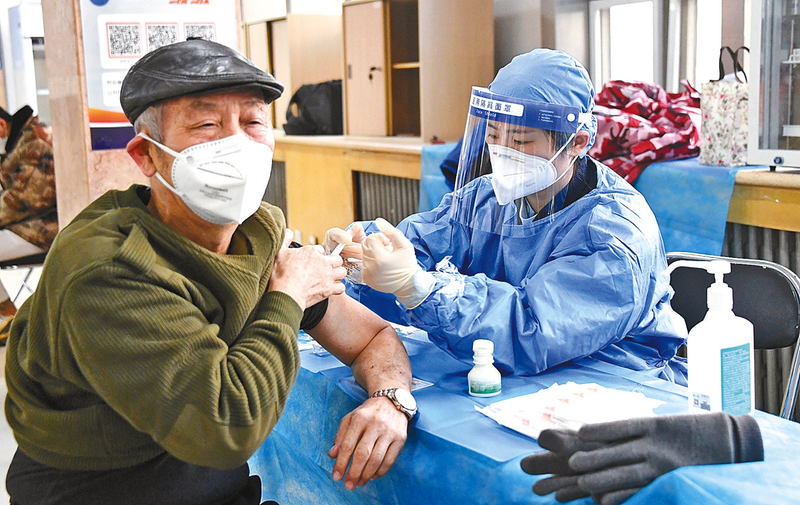 12月15日,在北京市海淀区中关村街道新冠疫苗接种点,医护人员为老年人接种新冠疫苗。 新华社记者 任 超 摄 新华社记者