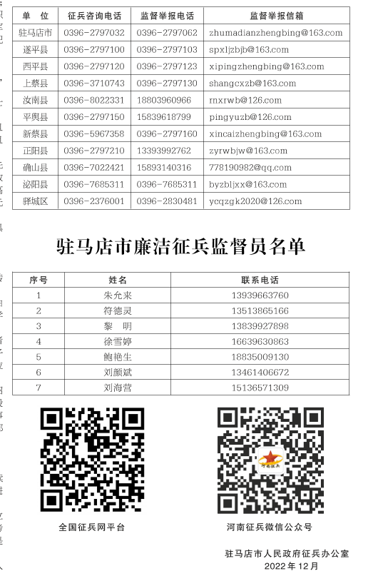 4.廉洁征兵监督员。省、市、县、乡设立廉洁征兵监督员,如有征兵廉洁问题可随时反馈,欢迎全社会共同监督。