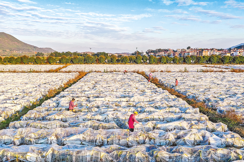 12月19日,在湖南省永州市蓝山县六七甲村,芋农在管护覆膜的香芋(无人机照片)。