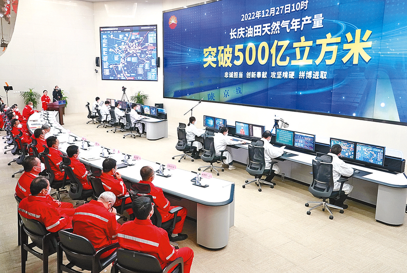 12月27日,在位于陕西西安的中国石油长庆油田生产指挥中心内,电子屏上显示天然气年产量突破500亿立方米。